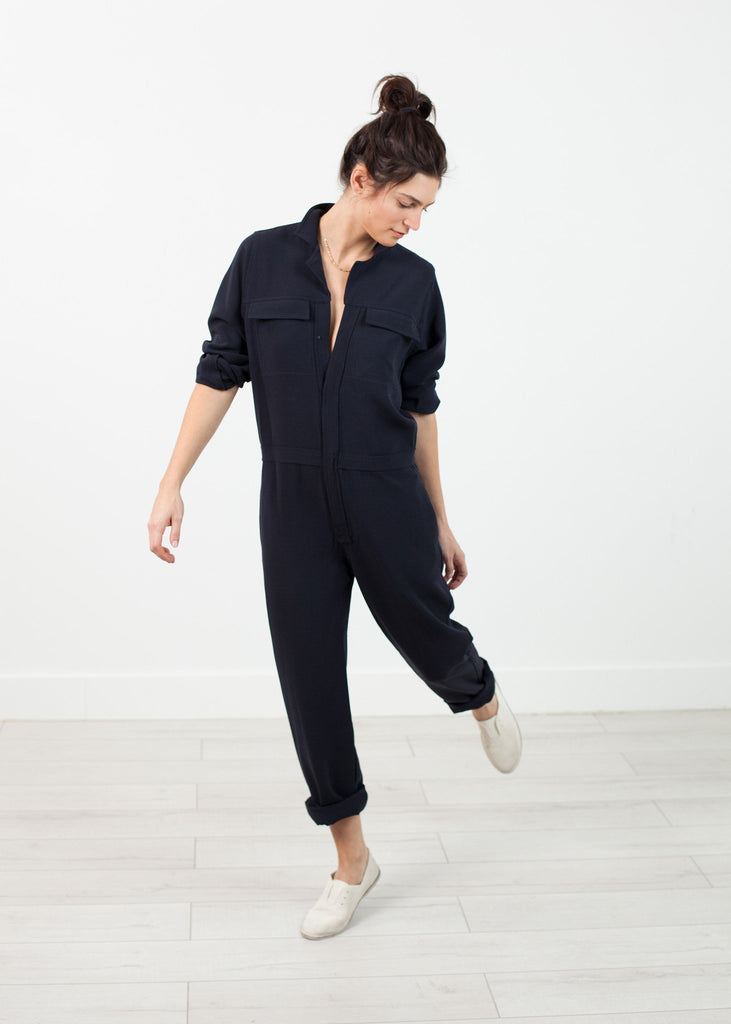 A modern one piece for the riveters at heart. The Worker Jumpsuit is utilitarian and adaptable, with sophisticated structure. Wide collar, classic cuffs, snap button and front zip closure. Side angled pockets. Harvey Faircloth. Color Navy. Made in U.S.A. Lana is wearing a size 2.